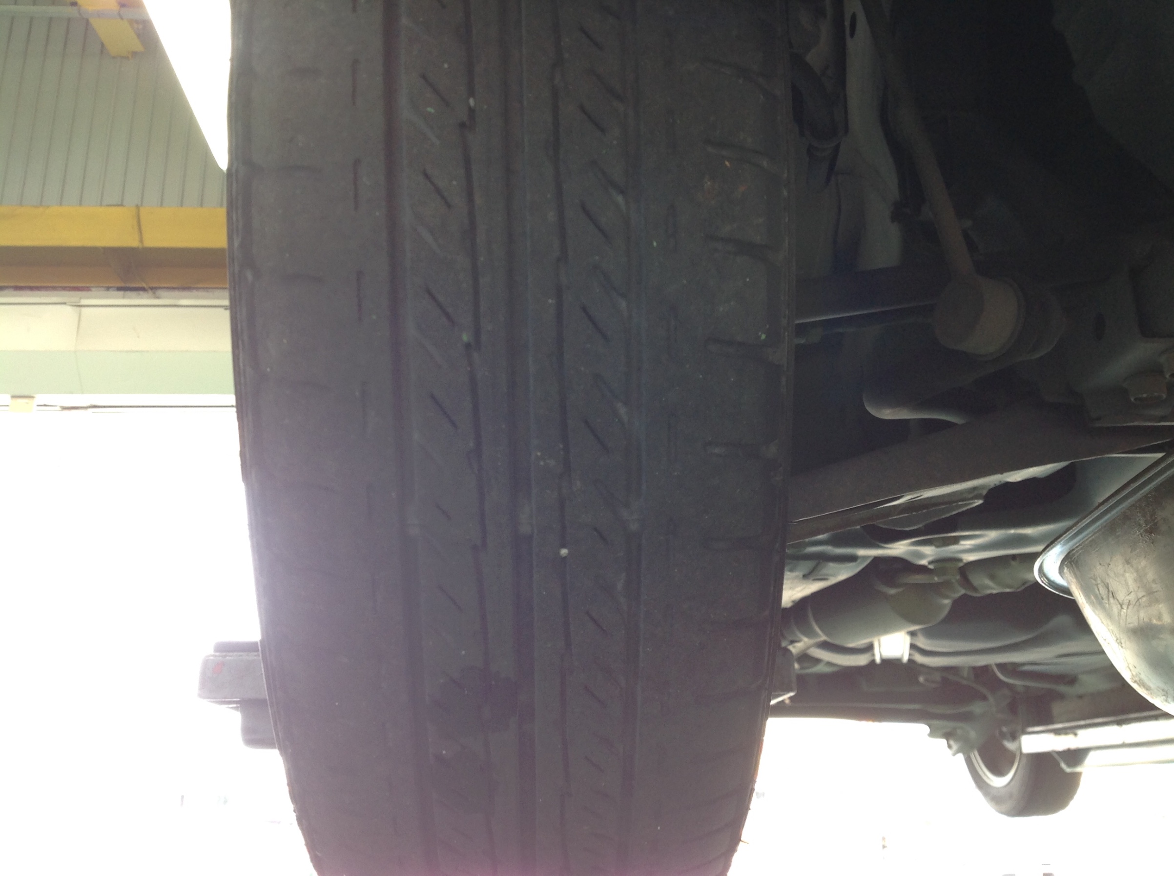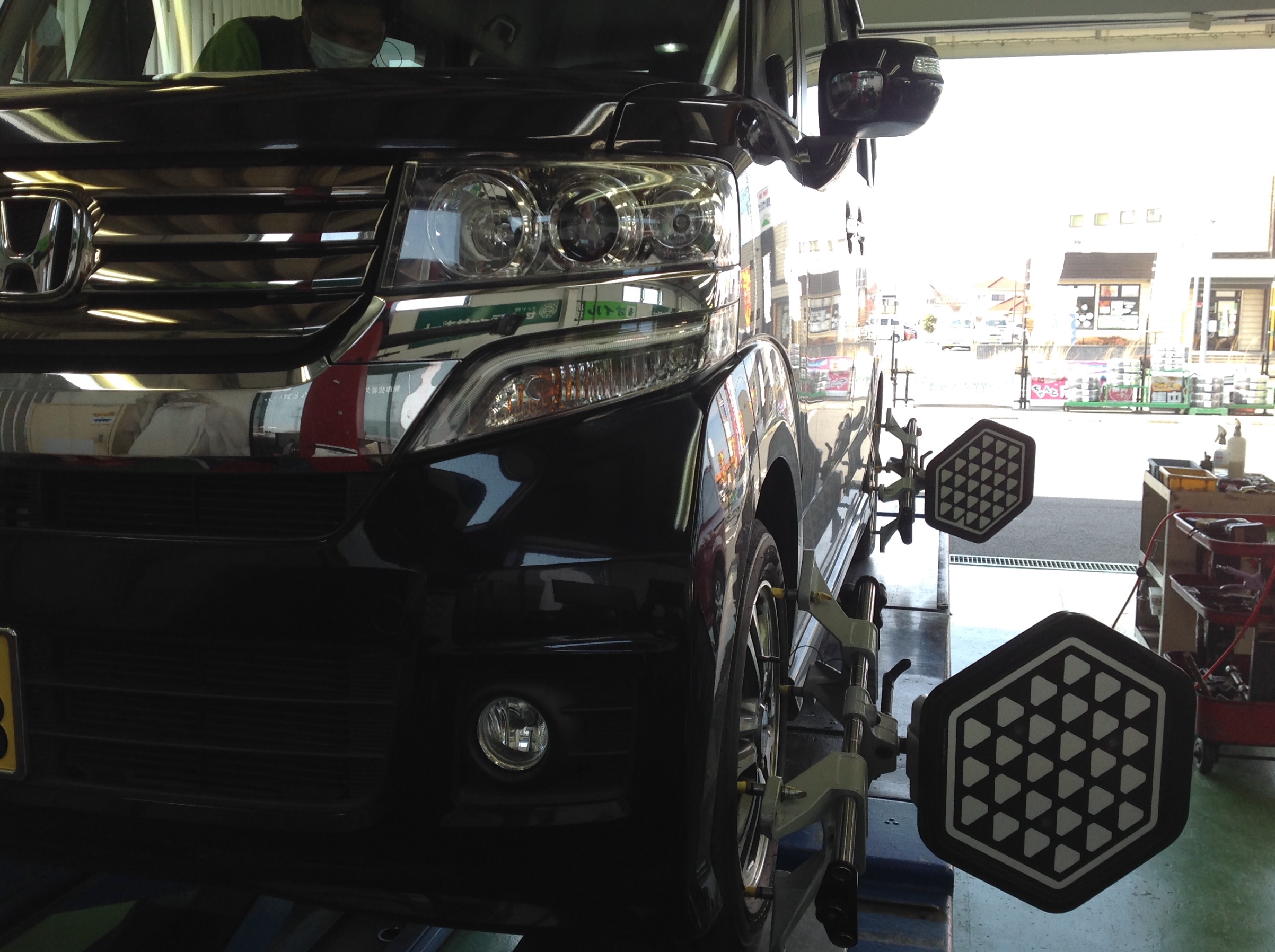 今回はレディースDAYでオイル交換でご来店して頂きました。タイヤの点検をしたところFタイヤの両側だけ溝がない状態になっていたので新品タイヤとアライメントの提案をさせて頂きました。空気圧不足もありましたが測定をしてみたいとのことで作業させて頂きました。