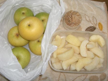 台風がひどくなる前に収穫したという貴重な梨をスタッフへ差し入れてくださいました。
