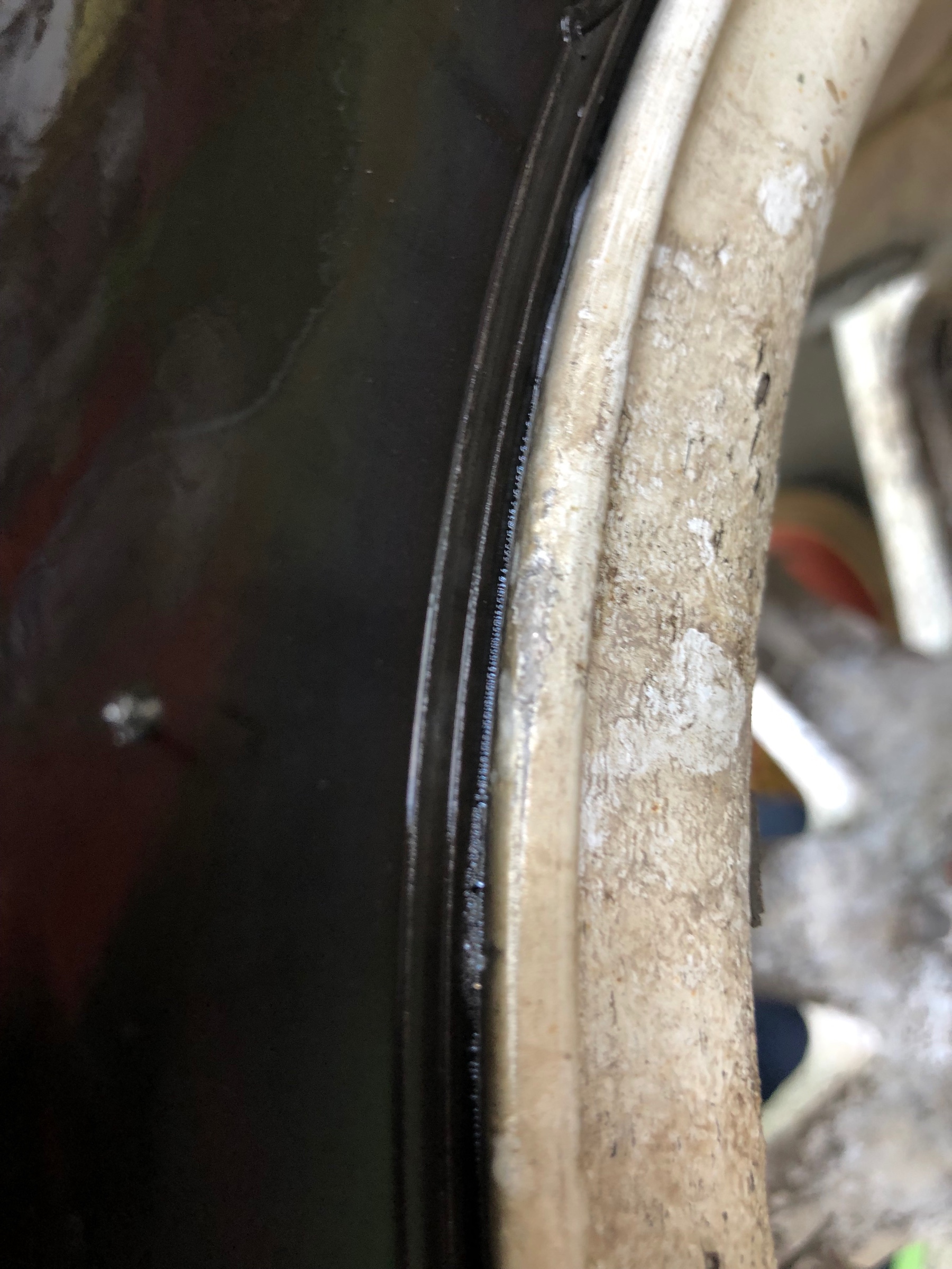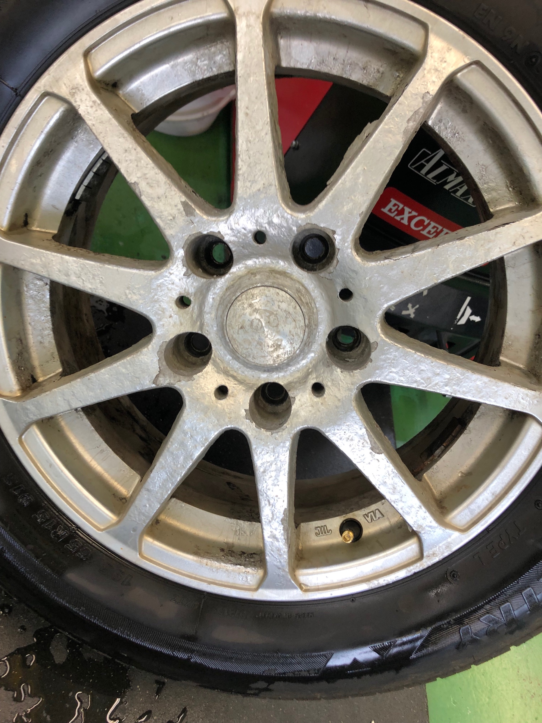 タイヤを点検させて頂くとホイールの腐食が原因で隙間から僅かに空気がもれていました。
