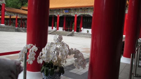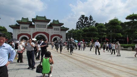 ここ忠烈祠は主に戦争で亡くなった英霊を祀る祠で、台湾政府の管理下にあって北安路に面した大門をくぐると、目の前には真っ白な石畳がまぶし広場と赤い屋根が美しい大殿がぱっと目に入ります。思わず驚きの声をあげてしまいそうですがここは神聖な地なので大声でのおしゃべり、喫煙は禁止なのです。