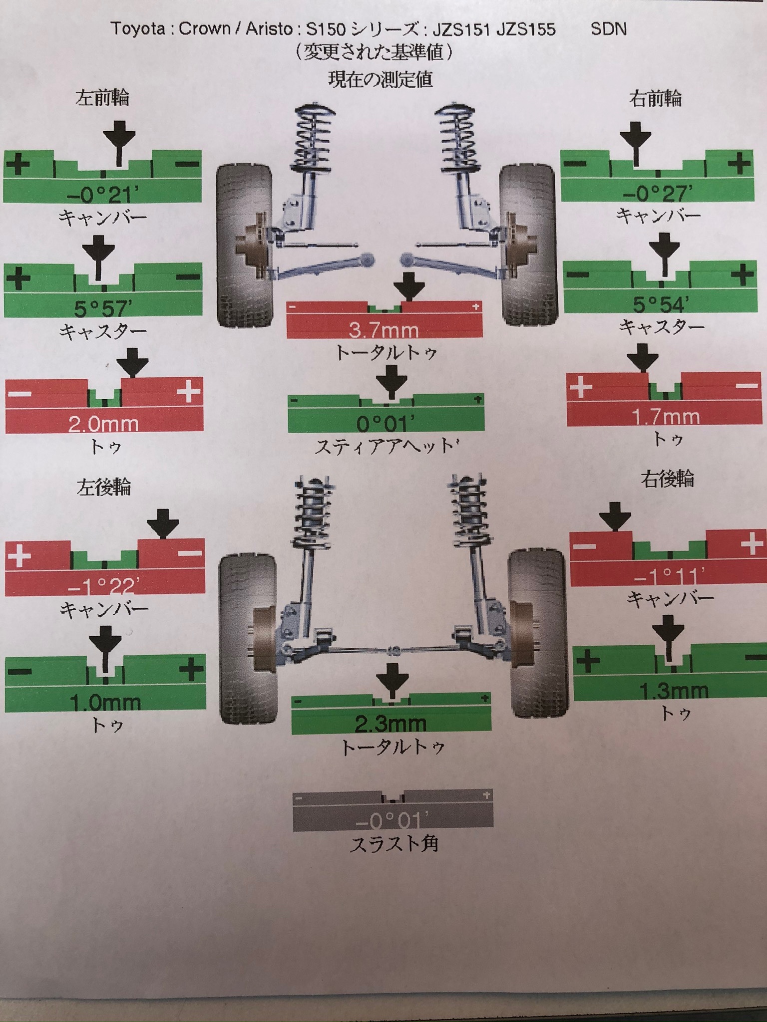 赤い枠は基準値よりズレていることを表しています。お車によって数値は異なります。