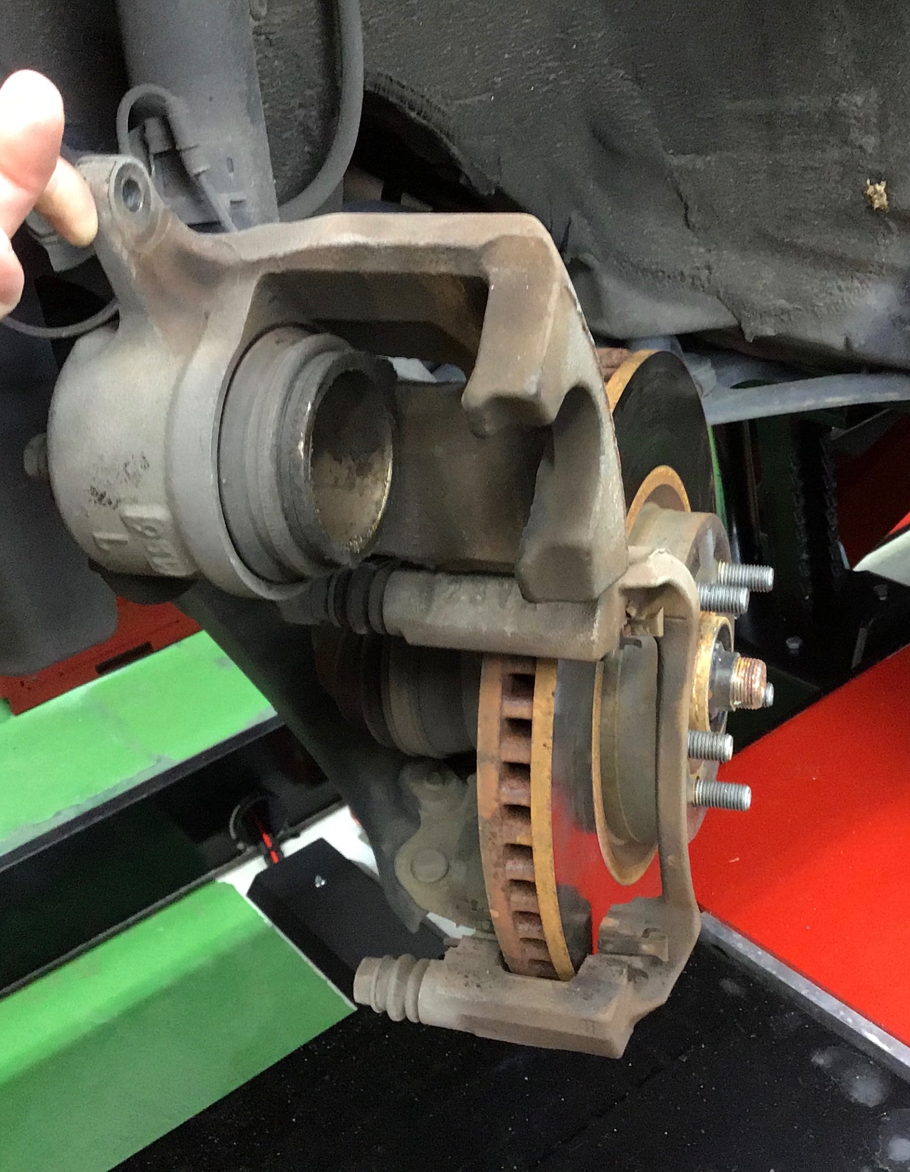 タイヤ・ホイールを外して、キャリパーを止めているネジを外していきます。。。