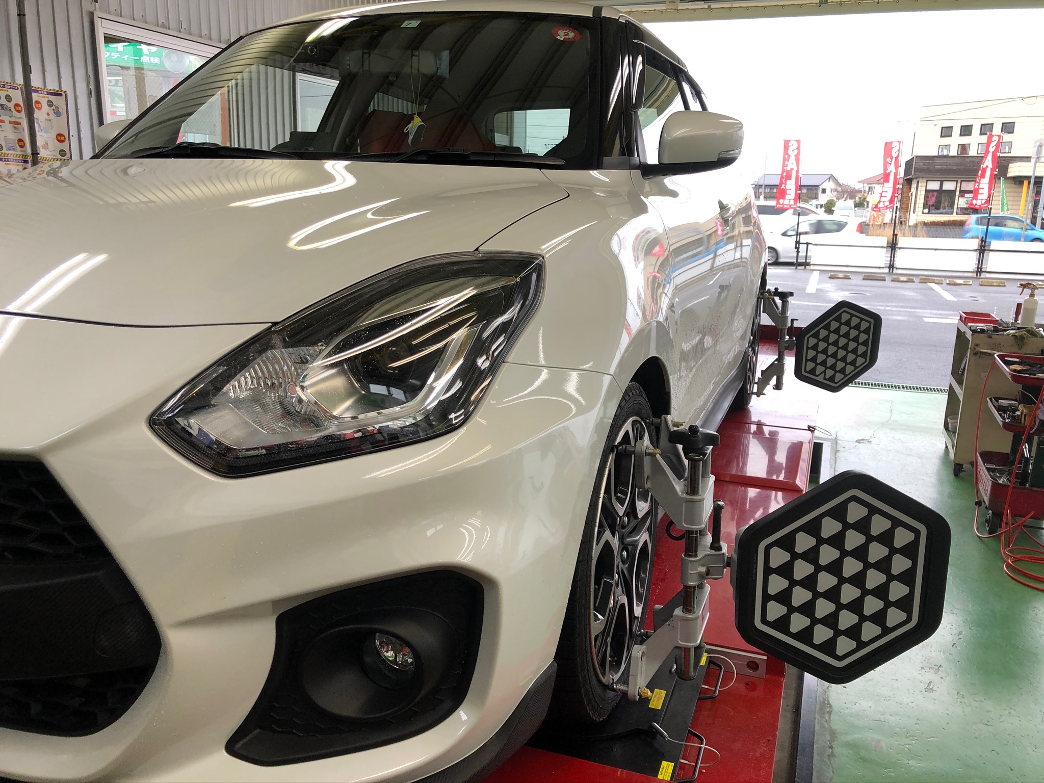 スイフトのアライメント依頼を承りました。ご紹介ありがとうございます。早速作業に入らせていただきます。