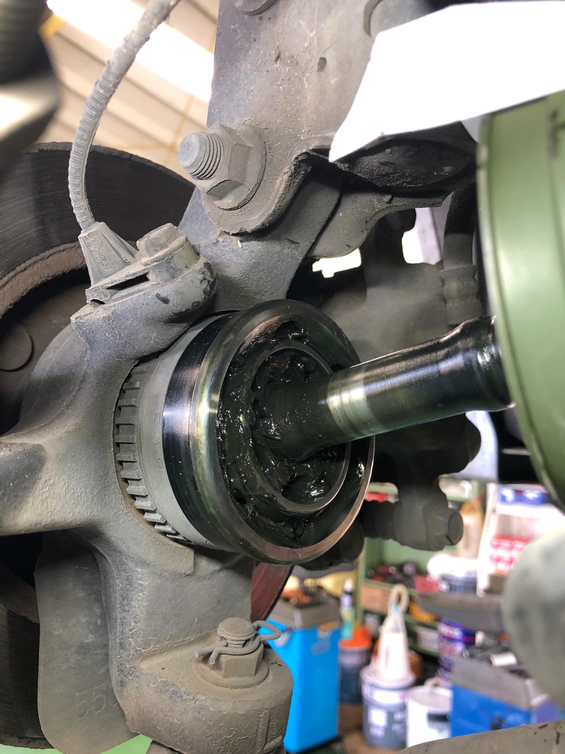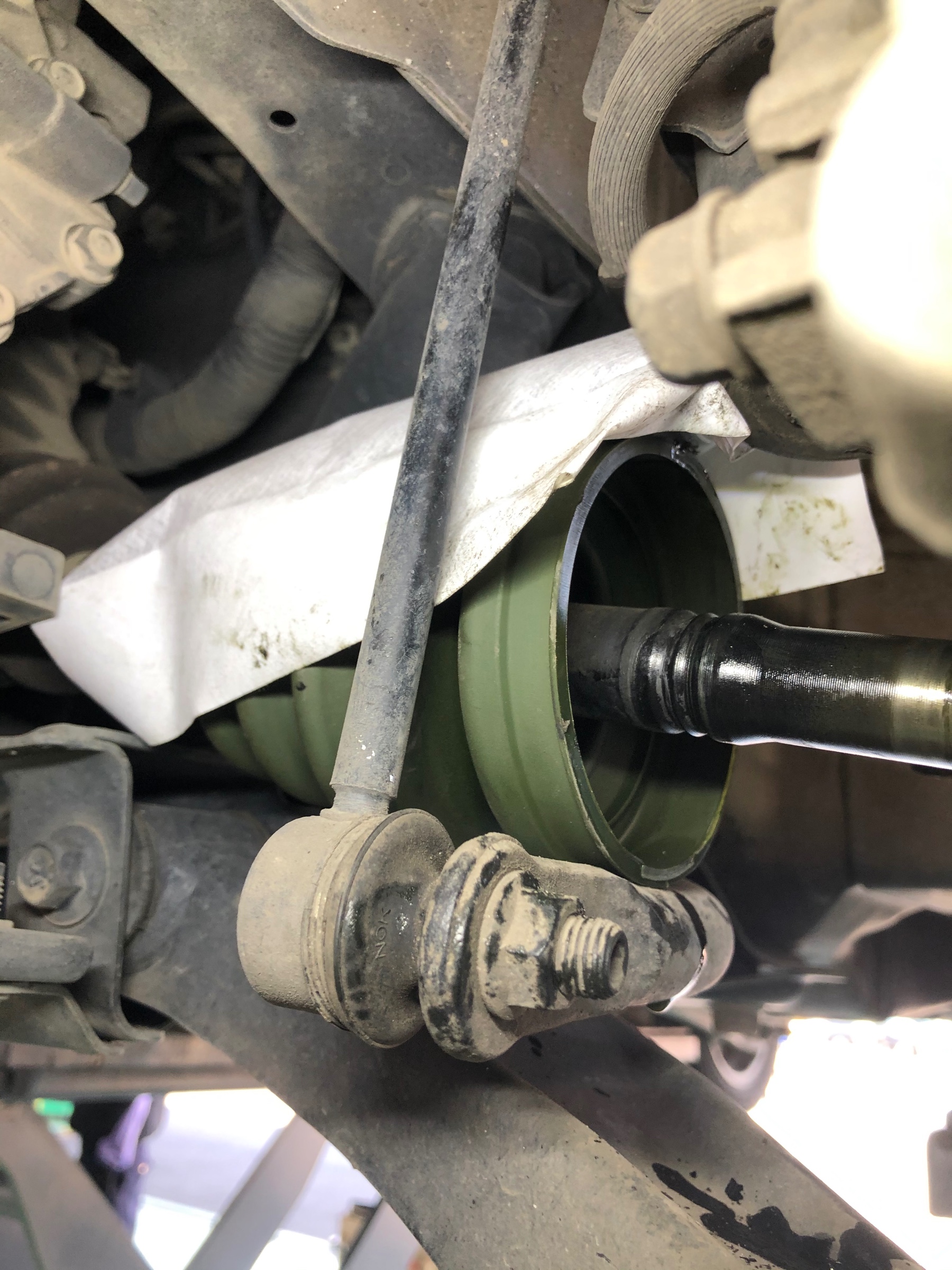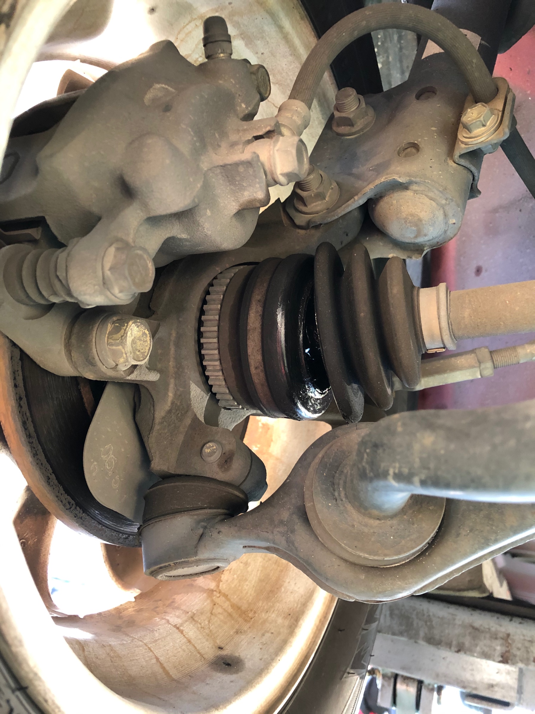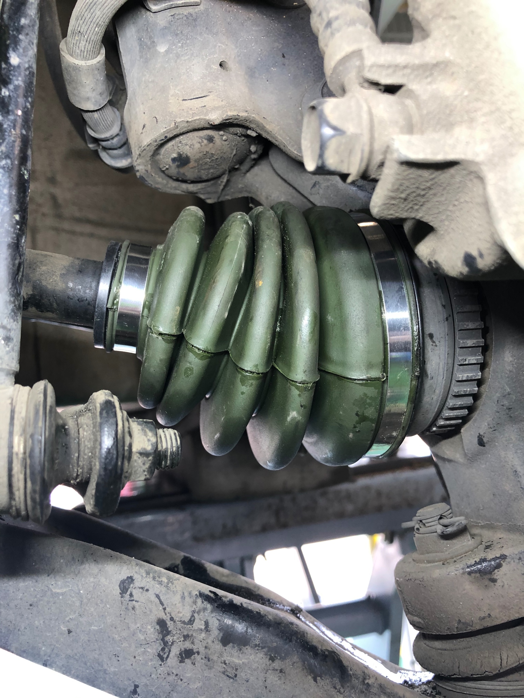 オイル交換で来店いただいたお客様。安全点検をしていると、ドライブシャフトブーツがパッカーンと、割れていました。