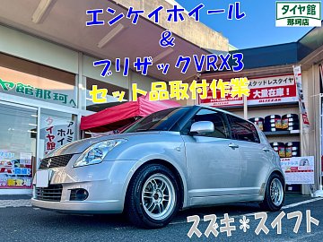 こんにちはタイヤ館那珂店です☆ 本日ご紹介させて頂く作業は、ご予約頂いておりましたスイフトのスタッドレス&ホイールセット品の取付作業になります♪ 取付しましたスタッドレスタイヤは、信頼と実績のブリザックVRX3になります☆彡 前モデルVRX2より氷上ブレーキ20%向上、摩耗ライフ17...