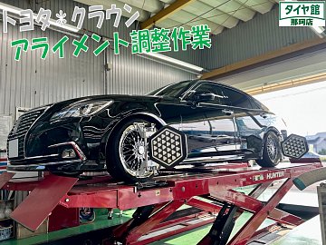 こんにちはタイヤ館那珂店です☆ 本日ご紹介させて頂く作業は、以前に車高調やホイール取付を行いましたクラウンのアライメント調整作業になります♪ 今回車高を少し変更しましたのでアライメント調整を行いました☆彡 調整個所は前後のトーのみとなります♪ 測定してみますと許容範囲には数値が収まっ...