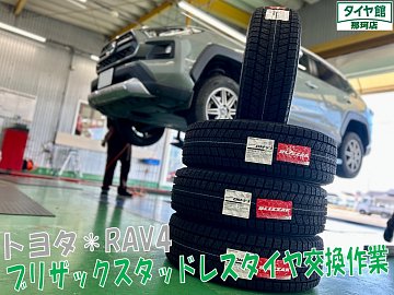 RAV4のスタッドレスタイヤ交換作業を行いました☆彡 装着しましたスタッドレスタイヤはSUV専用のブリザックDM-V3を装着しました♪ DM-V3は「アクティブ発泡ゴム2」のグリップ力をSUVでも最大限に発揮させるため、「SUV専用パタン」を開発し剛性を向上させたブロックと、溝を適正配置し...
