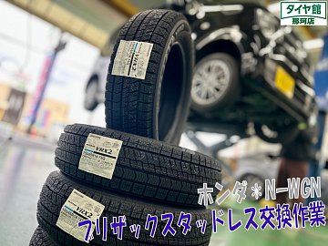 ご予約いただいておりましたN-WGNのスタッドレスタイヤ交換作業になります☆彡 スタッドレスタイヤはブリザックVRX2 155/65R14になりまして軽自動車では一番売れているサイズになります♪ ブリザックVRX2はアクティブ発泡ゴム2を採用していまして氷上ブレーキ性能が一つ前モデル...