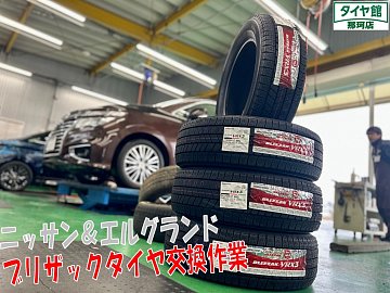 エルグランドのスタッドレス交換取付作業を行いました☆彡 タイヤはブリヂストンスタッドレスの中で凍結路面の効きがダントツでいいブリザックVRX3を装着♪ ※全ての商品について上記の性能・効果の発揮を一律に保証するものではございません。 センターフィットを使用してど真ん中にお取付しまし...