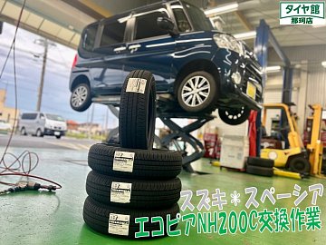 スペーシアのタイヤ交換作業を行いました☆彡 タイヤはエコピアNH200シリーズで新車装着タイヤ同等性能レベルになります♪ スペックはNH200Cサイズは軽自動車で一番多い155/65R14 4本交換です☆ エコピアは新車装着タイヤと同等レベルになりますので、お車の性能を落とさずお乗り...