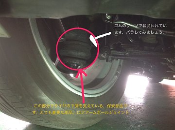 こんにちは、いつも当店のウエブを見ていただき有難うございます。 さて、今日は車検、足回りの、ロアボールについて、お話しいたします。 ガタが出てしまったら交換になりますので、ヒビの段階での交換おすすめデス!!