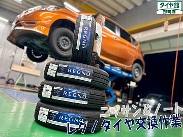 ノートのタイヤ交換作業を行いました☆彡 タイヤはブリヂストン最高峰のレグノGR-XⅡ 175/70R14 4本交換になります♪ コンパクトサイズは現行でGR-XⅡになりますので古いわけではありません! GR-XⅡでも十分問題なくライフ性能や静粛性が優れているからモデルチェンジに至らなかった...