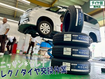 ご予約頂いておりましたセレナのタイヤ交換作業になります☆彡 タイヤはブリヂストンミニバンタイヤ最上級モデルレグノGRVⅡ 195/65R15 4本交換になります♪ 室内空間の広いミニバンはロードノイズ音がどうしても室内に響きやすいので走行中オーディオのボリュームを上げたり、後部座席と...