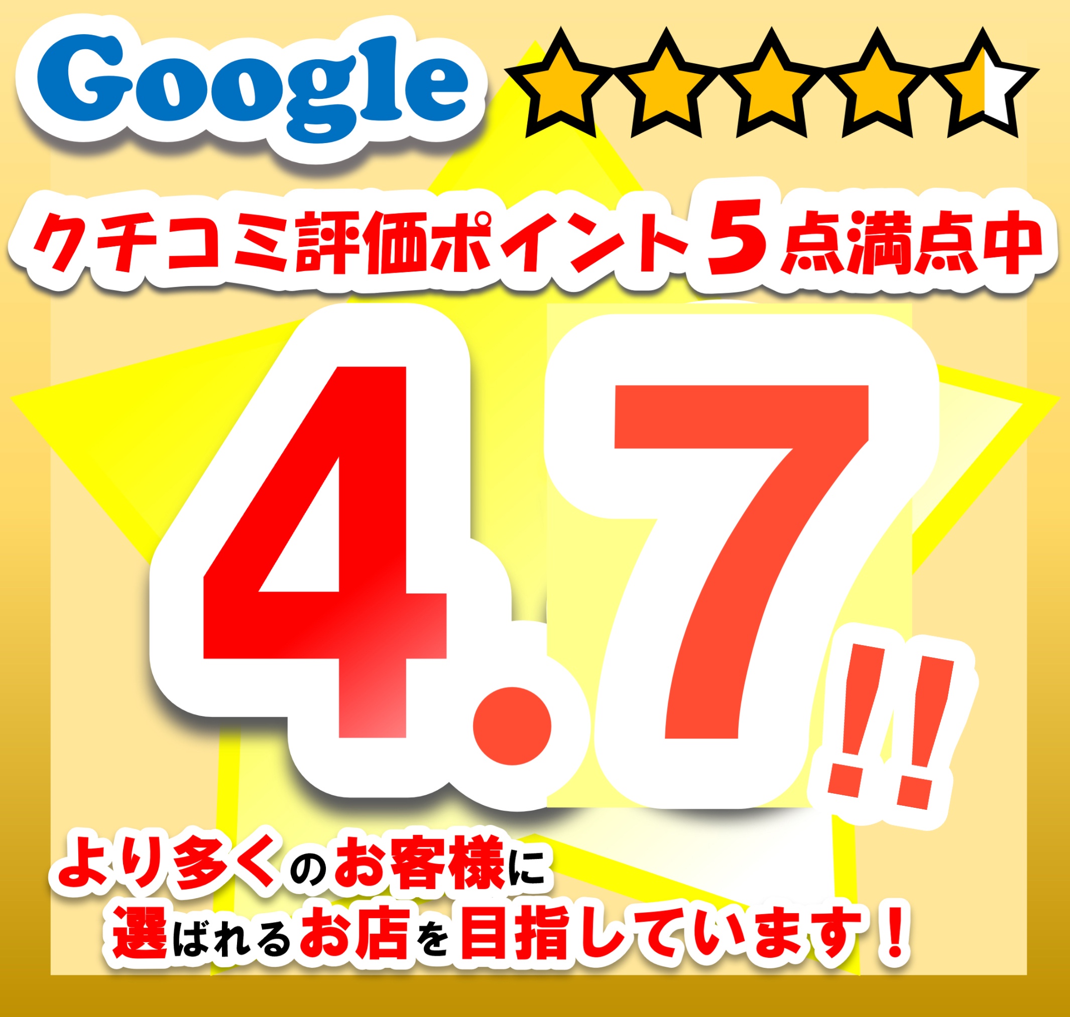 口コミ件数276件!!皆様のおかげで!!Google☆評価ポイントアップしました!!