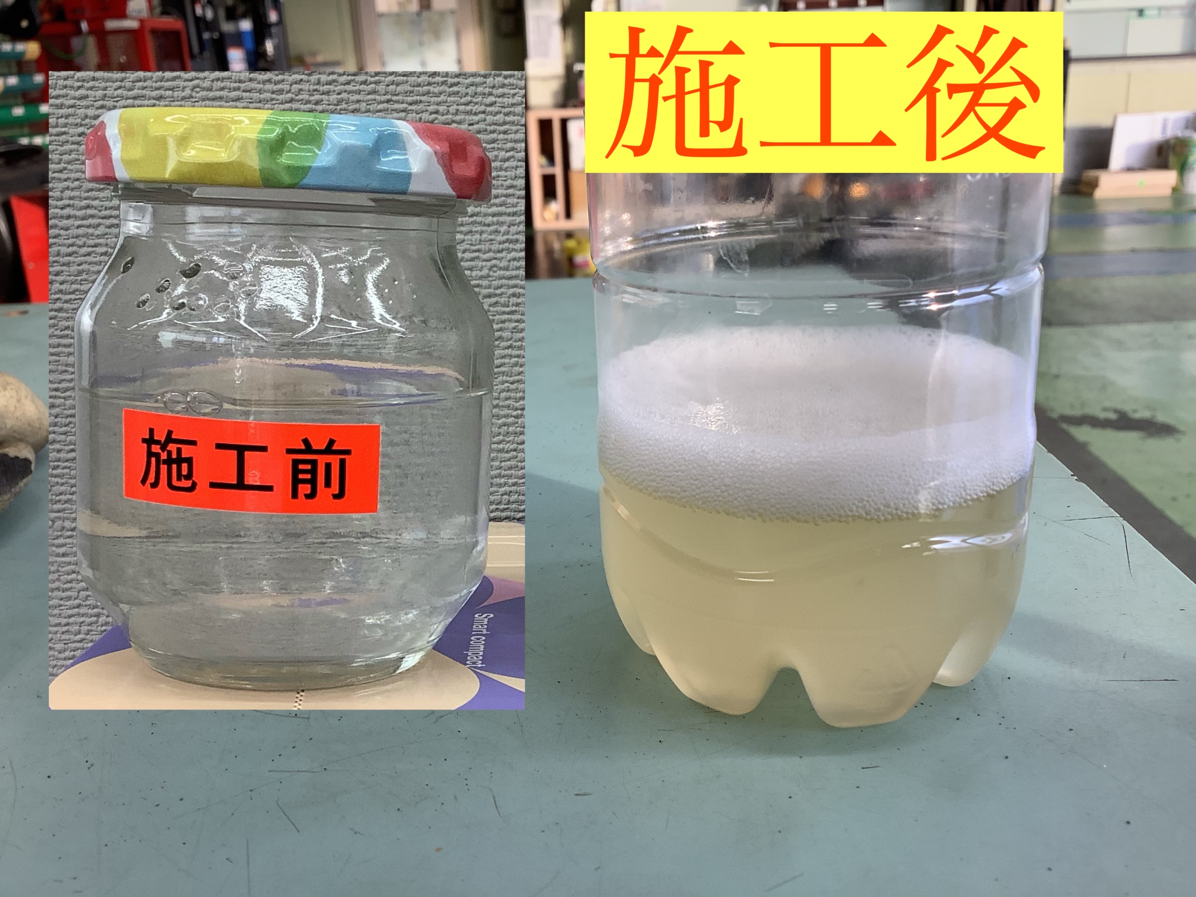 実際施工前と施工後の洗浄液の色の違いをご覧ください