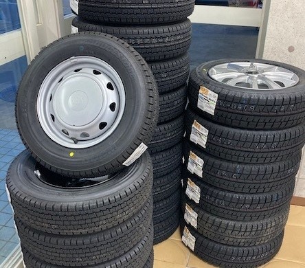 店頭では、乗用車、軽トラックに使用するスタッドレスタイヤの