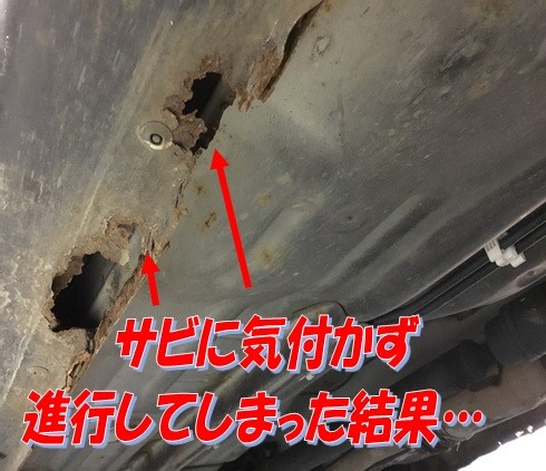 この車両はマフラーにも穴が開いてしまっている状態で、更には写真の通り車体にまで穴が開いてしまって