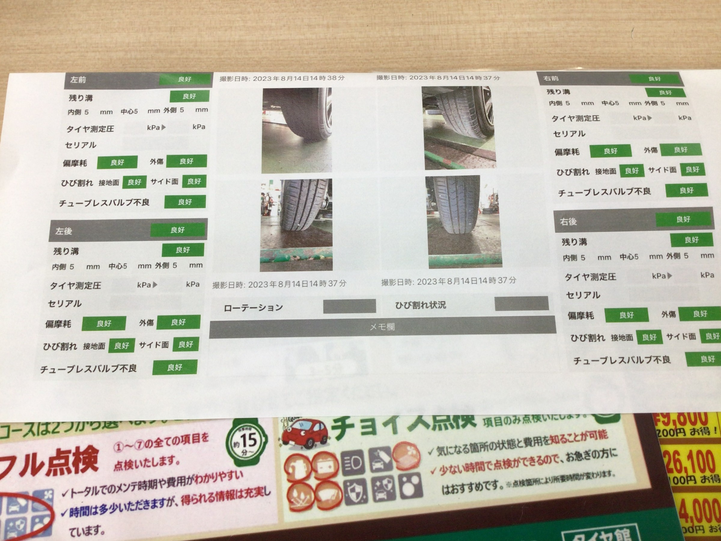空気圧・残りミゾ・偏摩耗・ひび割れ・4輪の減り方のばらつき等点検させていただきます。