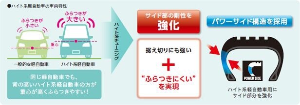 その中でも「REGNO GR–Leggera」は、重心が高く風や路面のうねり・凹凸によって走行中フラつきやすい背の高い軽自動車(ハイト系)の対策として、タイヤの側面を強化(剛性を高める)した構造のためフラつきを防止した特別仕様になってます。