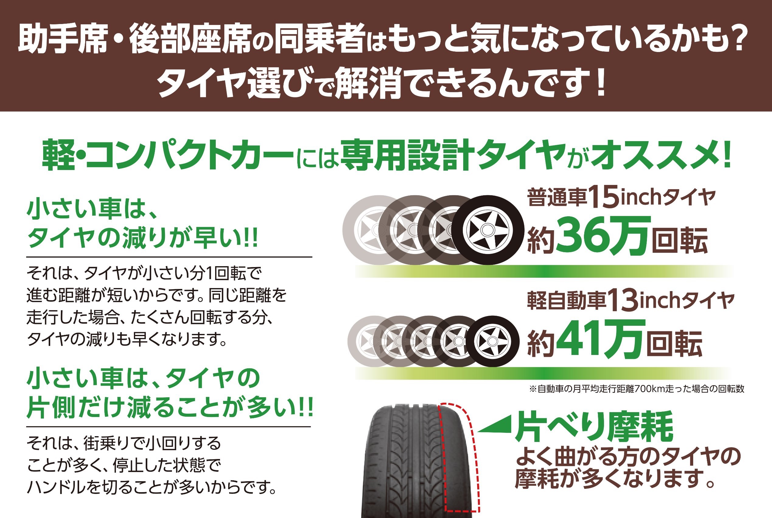 以上のようなことから、タイヤの擦り減りが早くなったり、偏摩耗になりがちな傾向のため、摩耗・偏摩耗に強い「軽自動車・コンパクトカー専用タイヤ」が発売されるようになりました。