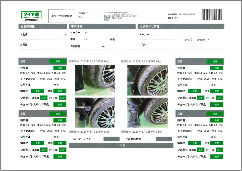 タイヤ点検結果は、画像付きの点検結果シートを使ってご報告させていただきます。