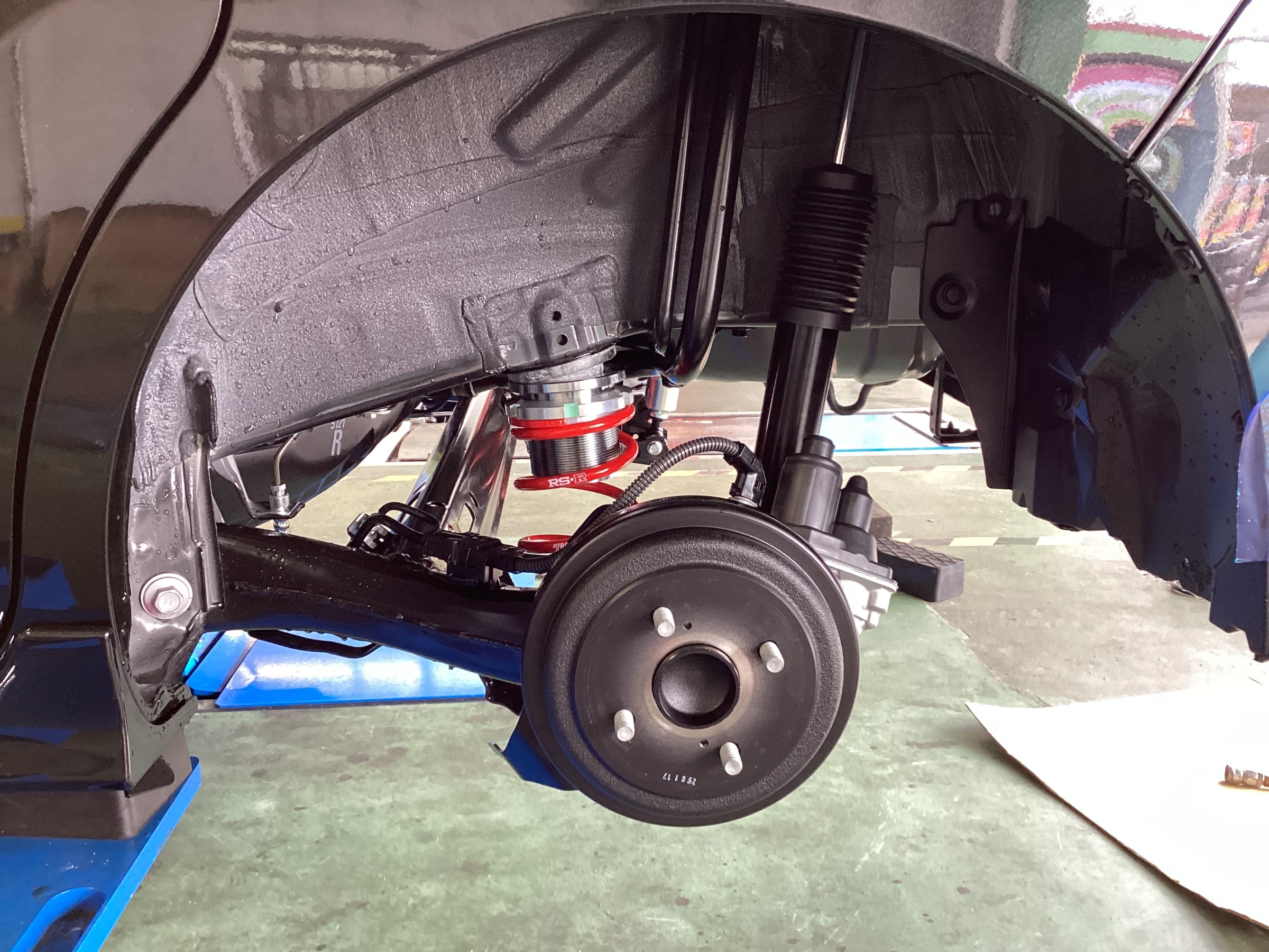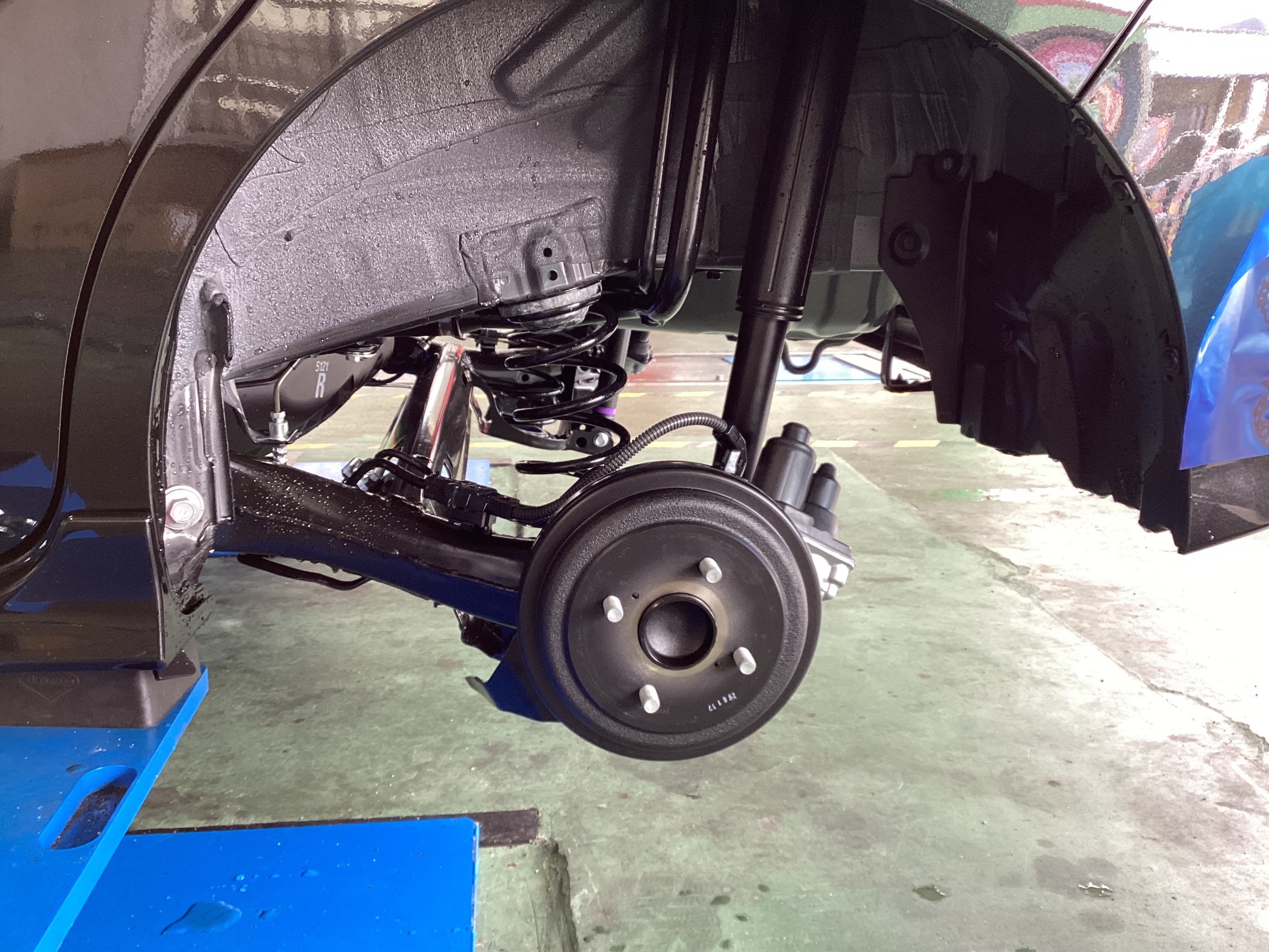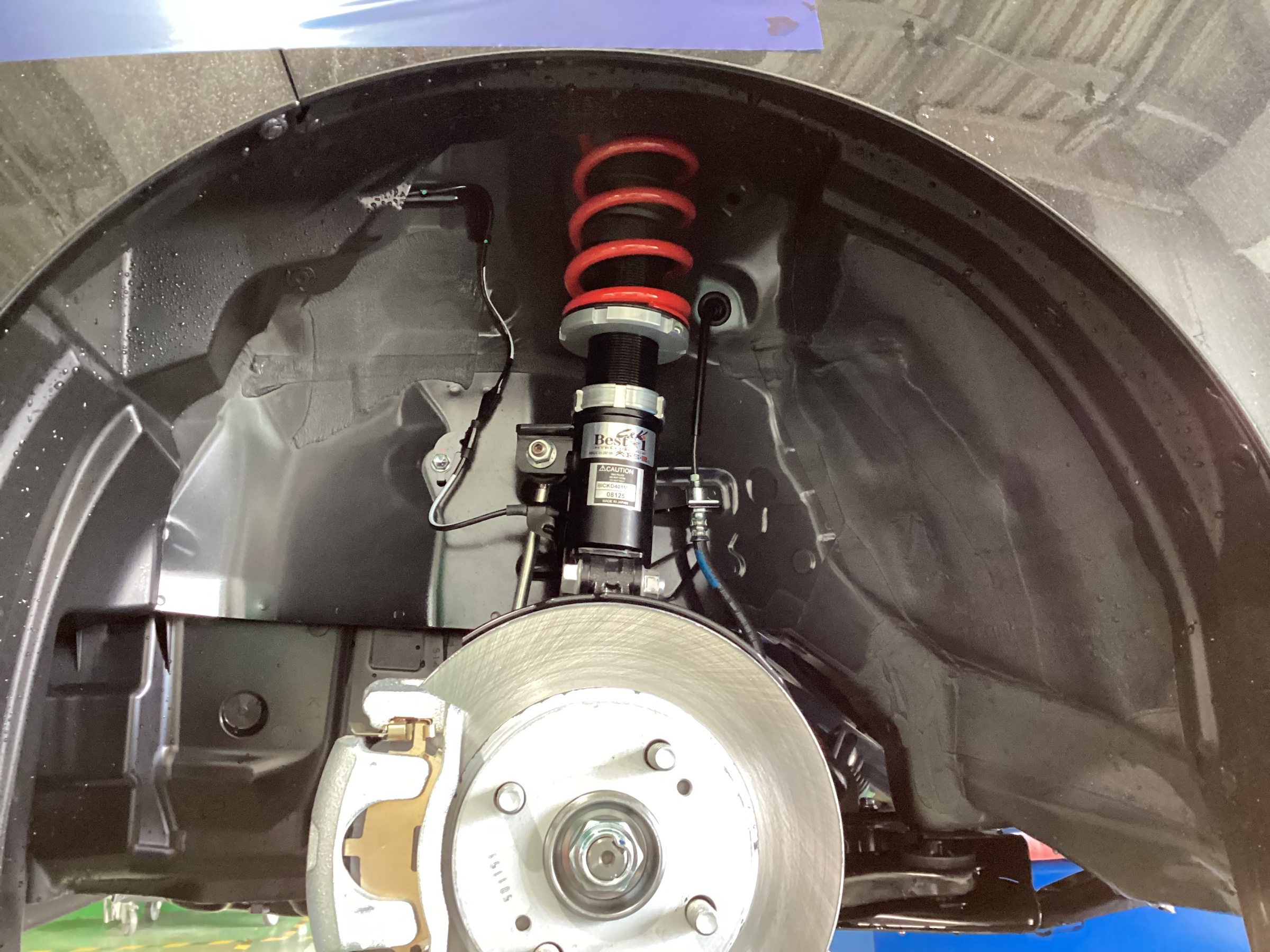 お客様のご要望で車高調整式のサスペンションキット、いわゆる「車高調」を取り付けてよりスタイリッシュにローダウンし、愛車をさらに魅力的に仕立てたい。