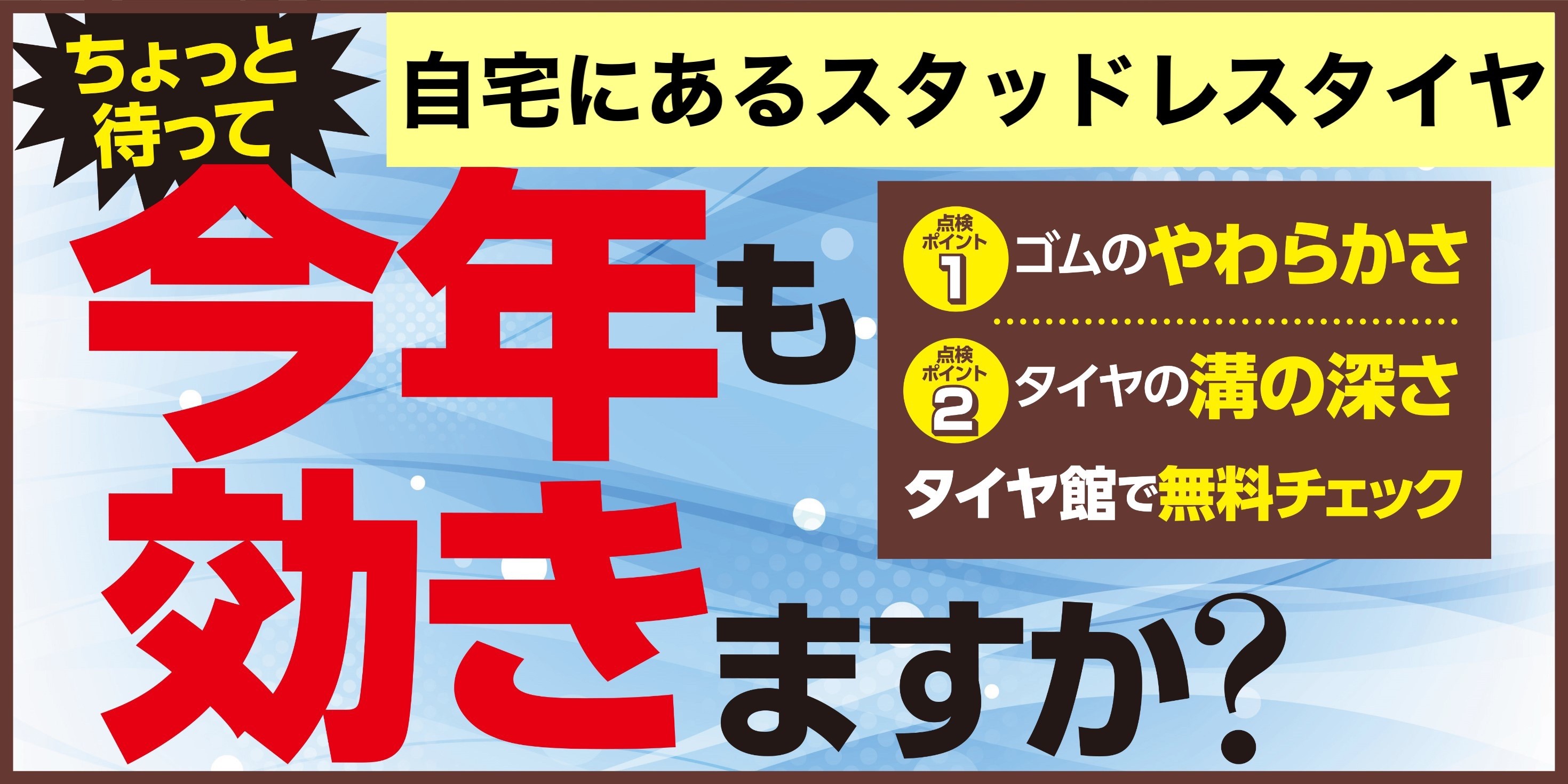 そんなタイヤを装着して冬道を走行中にスリップして怖い目に遭った...ってことなが無いように装着シーズン前にタイヤ館でスタッドレスタイヤの点検をしませんか?ご自宅に保管されているスタッドレスタイヤ1本だけタイヤ館にお持ちいただければ無料でチェック致します。