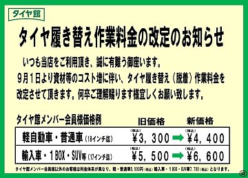 作業料金改定のお知らせ