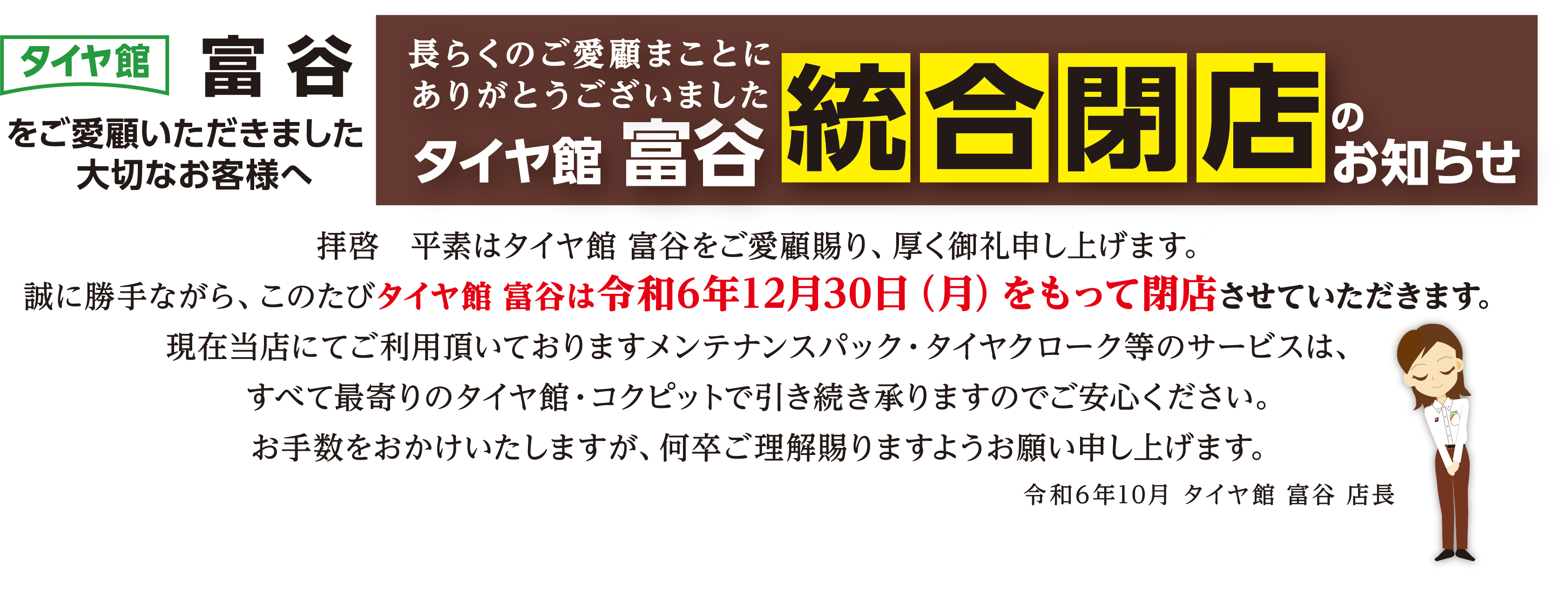 タイヤ館富谷店が2024年12月30日の営業終了をもって宮城県内店舗への統合閉店となります。