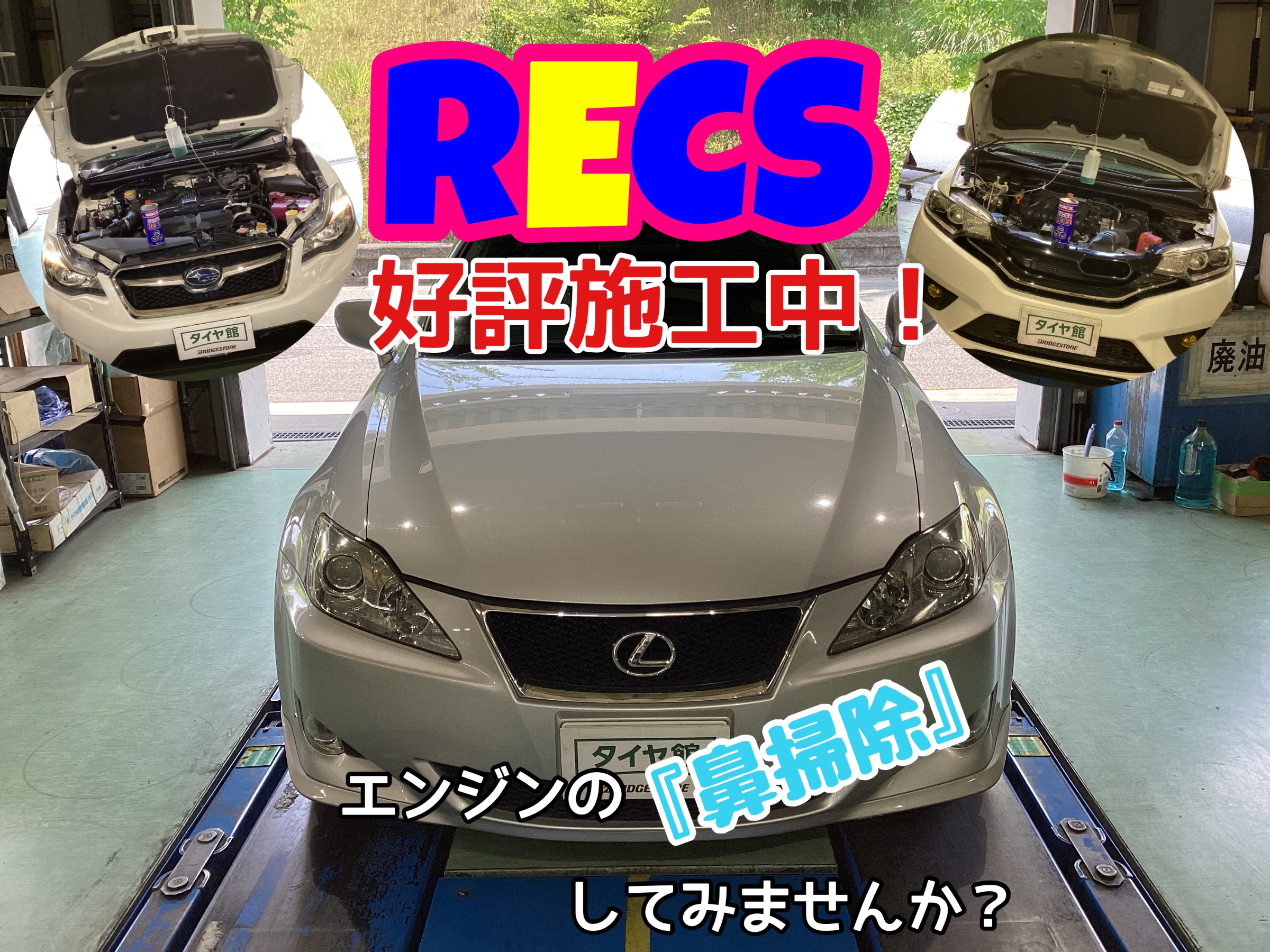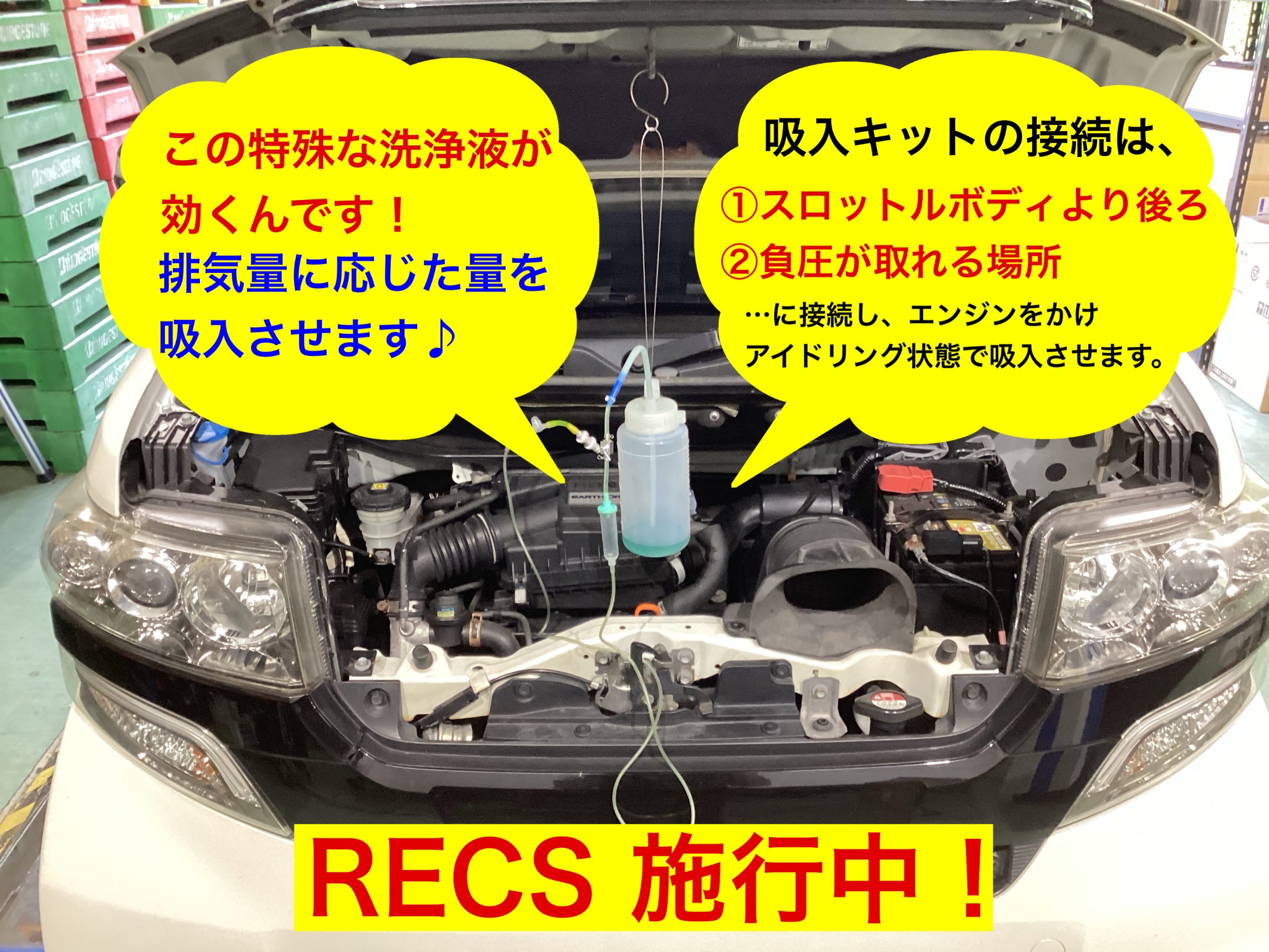 RECS(レックス)は特殊な洗浄液をエンジンに吸わせて、吸気経路や燃焼室に溜まった汚れを洗浄し、エンジンの調子を回復させてくれるサービスになります。