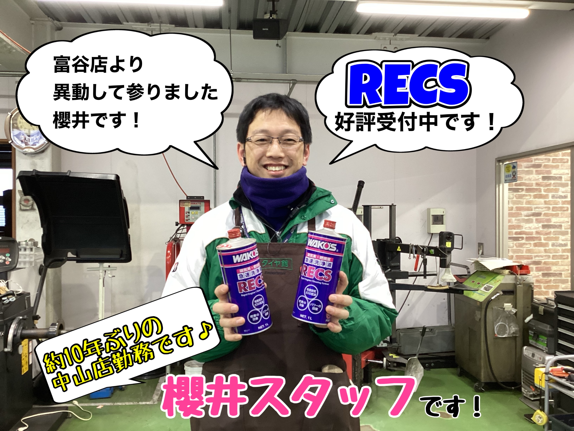 タイヤ館富谷店でRECSを担当していた櫻井スタッフが、タイヤ館中山店に異動してきました。