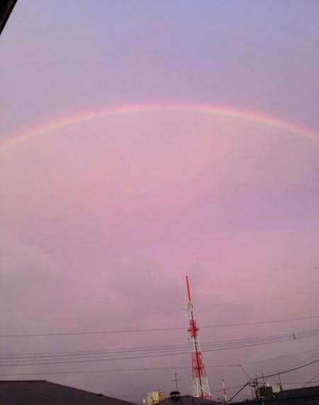 台風が過ぎて夕方空を見上げたらオレンジ色の空しかも大きな虹が出てました。