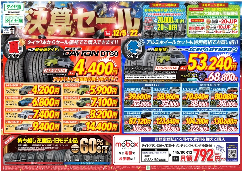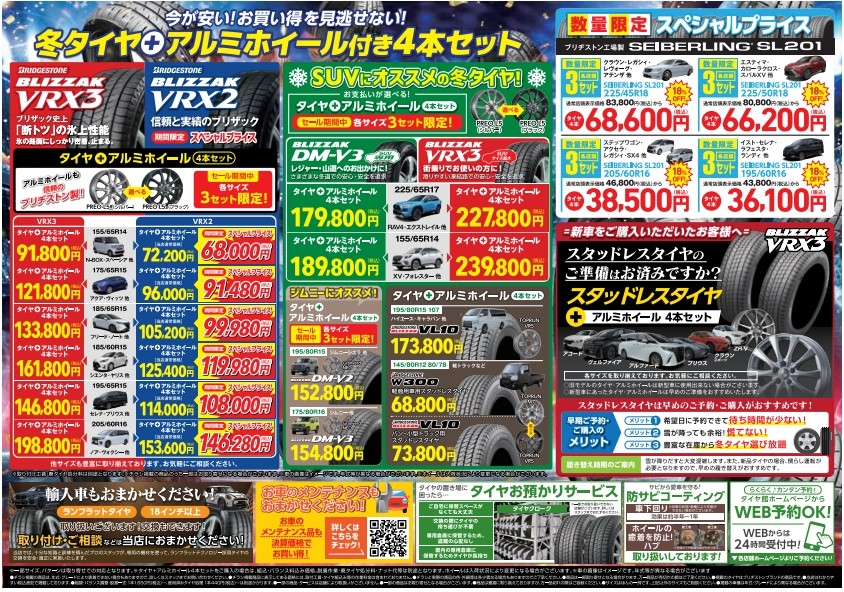 今年最後のタイヤ大売り出し!新しいタイヤで年末年始を安全に楽しくすごしましょう! ポスト 2024年12月5日 関連情報もあわせてご覧ください ★最新WEBチラシを今すぐチェック★ タイヤ館 鹿児島 住所:890-0072鹿児島県鹿児島市新栄町4-23 電話番号: 099-808-0035 相談予約