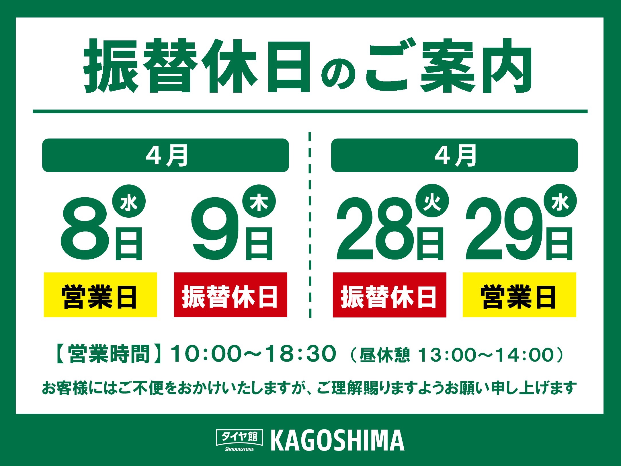 4月28日(火)店休日 / 29日(水・祝)通常営業となります。 ポスト 2026年4月28日 本日4月28日(火)は店休日となります。ご了承ください。 29日(水・祝)は 通常営業 いたします。ご来店お待ちしております。 タイヤ館 鹿児島 住所:890-0072鹿児島県鹿児島市新栄町4-23 電話番号: 099-808-0035 相談予約