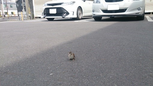 すずめのこどもが疲れて?駐車場でチュンチュンないておりました。