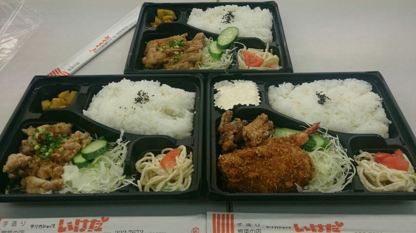 御弁当 ポスト 2017年8月15日 タイヤ館南林寺のトミーです。 今回はお昼ご飯のメニューを紹介します。 いつもお世話になっている「デリカショップいけだ」でお弁当を注文しました。 店長はミックスフライ弁当(写真右下)、僕と尾田原さんはチキンネギソース弁当(写真左下と上)を注文しました。 どれもボリュームが良くてとても美味しかったです。 タイヤ館南林寺から歩いて約5分くらいのところにお店があるので、是非食べてみて下さい。 担当:トミー