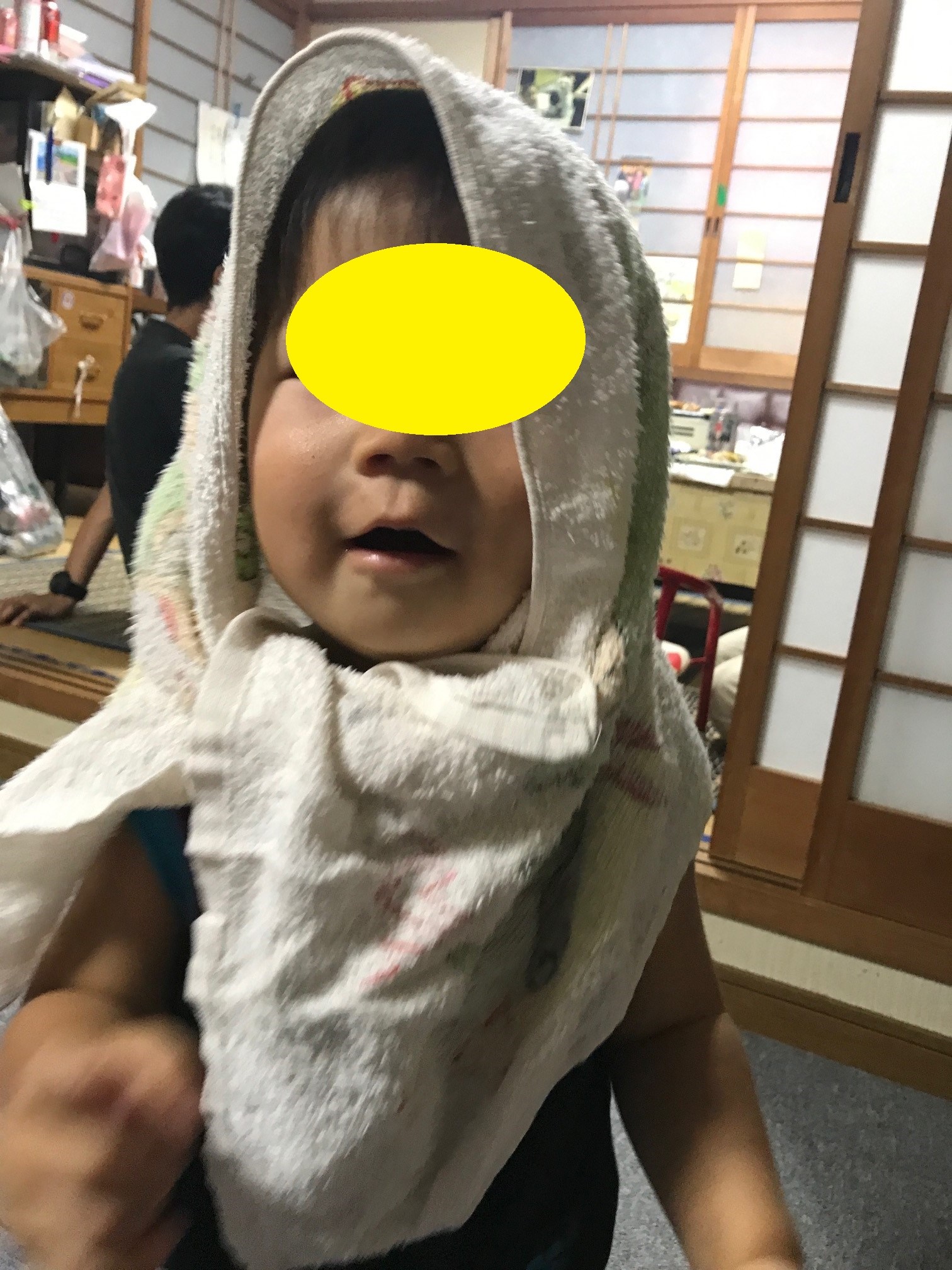 頭にタオルを巻いてあげると 嬉しくてみんなに自慢しに行きます。