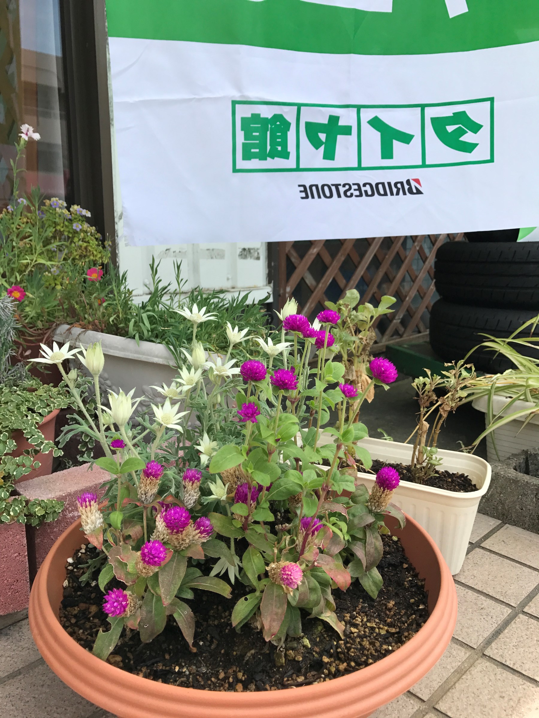 タイヤ館南林寺のお店の入口にお花を植えています。