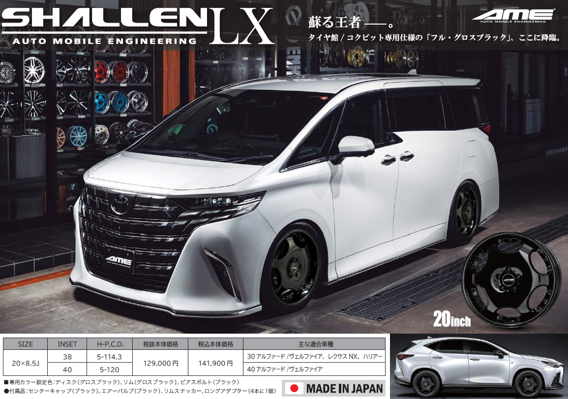 タイヤ館/コクピット専用仕様 「SHALLEN LX Black Edition」 フルグロスブラック(専用仕様・数量限定) 店内展示しております。ぜひお立ち寄りください。 40 アルファード × SHALLEN LX Black Edition 30 アルファード × SHALLEN LX Black Edition 220 クラウンRS × SHALLEN LX Black Edition ...