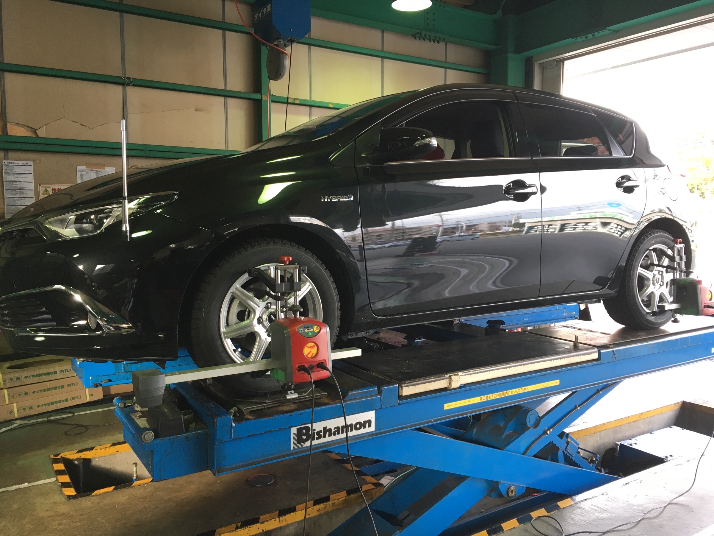 先日、トヨタのオーリスハイブリッドにスタッドレスタイヤ取付とアライメントを実施しました。