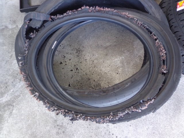 そのまま気づかず走り続けた結果、タイヤが破壊されたものです。
