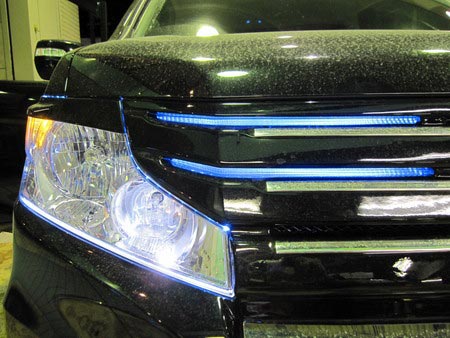 バンパー内をブルーに光らし、ヘッドライトの上部を横点灯のLEDテープで