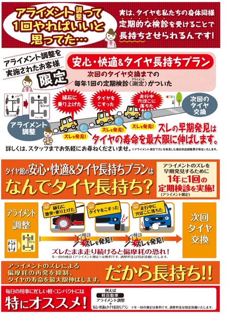 【サービス】 安心・快適&タイヤ長持ちプラン ポスト アライメント調整を実施されたお客様限定で「安心・快適&タイヤ長持ちプラン」をご用意しています。 加入していただくと、次回タイヤ交換(最長4年間)まで“年1回”のアライメント測定を無料にて実施いたします。 タイヤも私たちの身体同様、定期的な検診を受けることで長持ちさせられるんです!ズレの早期発見はタイヤの寿命を最大限に伸ばします。 詳しくはスタッフまでお問い合わせください♪ ※長持ちプラン加入料は別途頂戴いたします。 ※調整が必要な場合、調整料金は別途発生いたします。 2016.6 カテゴリ:商品情報 タイヤ関連