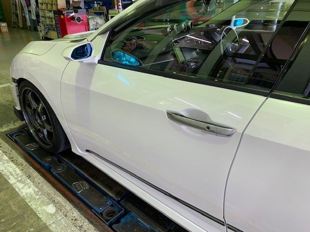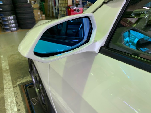 今回はY様と色々と話し合いさりげなく純正風にする為、全体をボディ同色のパールホワイトでミラー内側を艶消しブラックにさせていただきました(^^♪