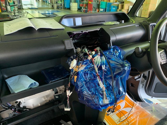 ナビ取り付けは配線作業がほとんどなので、いろいろな配線をキレイに収納できれば、あとはナビに配線を接続して完成で~す(*^^)v ⇩