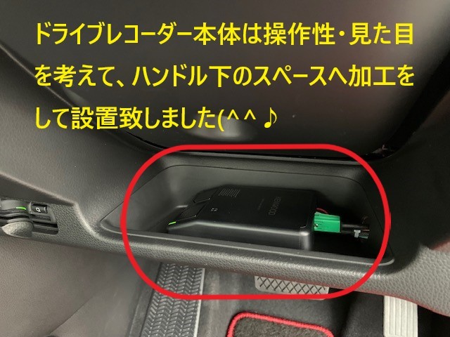 今回のドライブレコーダーはナビ連携型なので、ナビの大きな画面で録画映像を見れるのですがメモリーをする本体を設置しないといけないので、本体操作やSDカードの取り出しなどを考えてちょうどいい感じのスペースがハンドル下にありましたので、少し加工をしてキレイに設置できました(*^^)v
