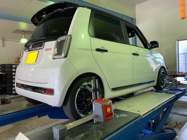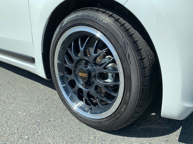 ご注文いただいていたBBSホイールを装着し、フロントの出ずらを少し調整してからアライメント調整をさせていただきました(*'ω'*)