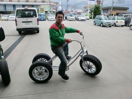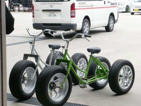 会場にB'STYLE EXとエコピアを3つ装着した、エコサイクル(自転車を3輪に改造した乗り物)もあり、転がり抵抗の差による出足の軽さの違いも体感してきました。