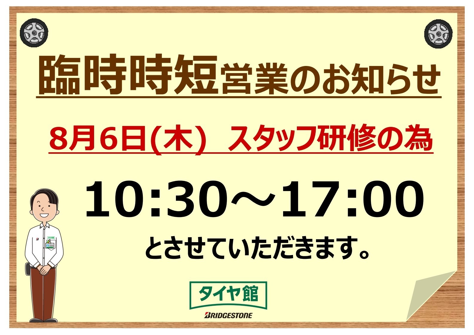 8月6日(木)は、スタッフ研修の為、17時閉店となります。