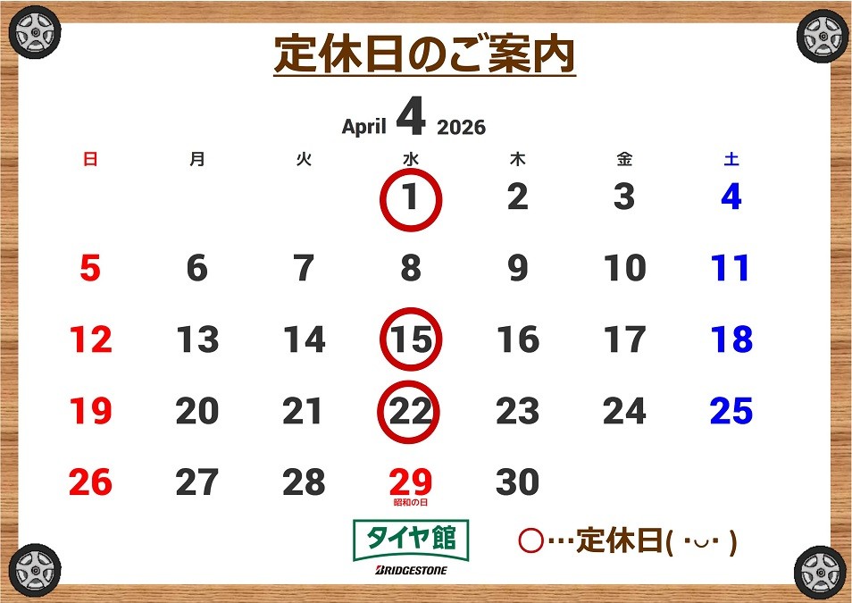 4月15日(水曜日)は、定休日となります(´。•ㅅ•。`) WEBでは作業予約・タイヤオンラインストア24時間受付中!